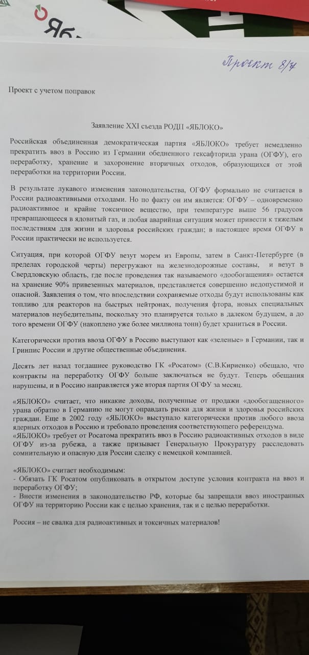 В эти выходные проходил XXI съезд партии Яблоко, помимо выборов Председателя партии, принято несколько резолюций одна из них по вопросу ввоза ОГФУ в Россию