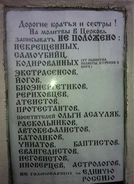 вот-вот. ну ладно бы один, ну два поста, а то прям весь трафик извел. придурков в церкви полно конечно, но глумиться то зачем? сам не веришь, так хотя бы из уважения к предкам постыдился.
