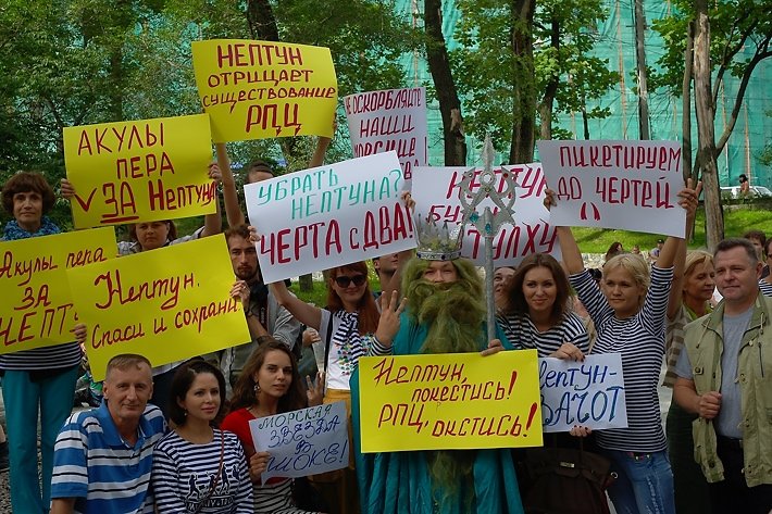 В ответ на вероломные и оскорбляющие чувства верующих в Нептуна заявления отдельных сотрудников ФГУП РПЦ о недопустимости присутствия Нептуна на дне ВМФ и других праздниках, в "Адмиральском Сквере" Владивостока, у памятника Нептуну состоялся санкционированный митинг в поддержку морского владыки: