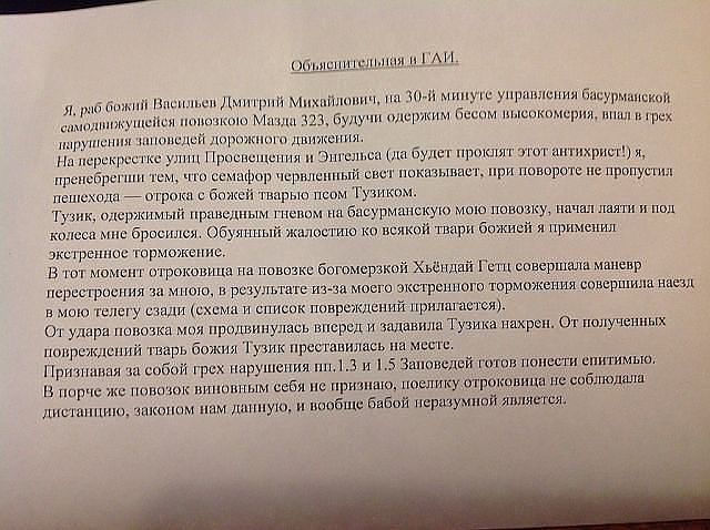 Вчера у меня скрутили номера, потому что ехала без техосмотра. Седня забрали права, потому что ехала без номеров, завтра заберут машину, потому что ехала без прав, а послезавтра меня заберут в дурдом, потому что ехала без машины!!!